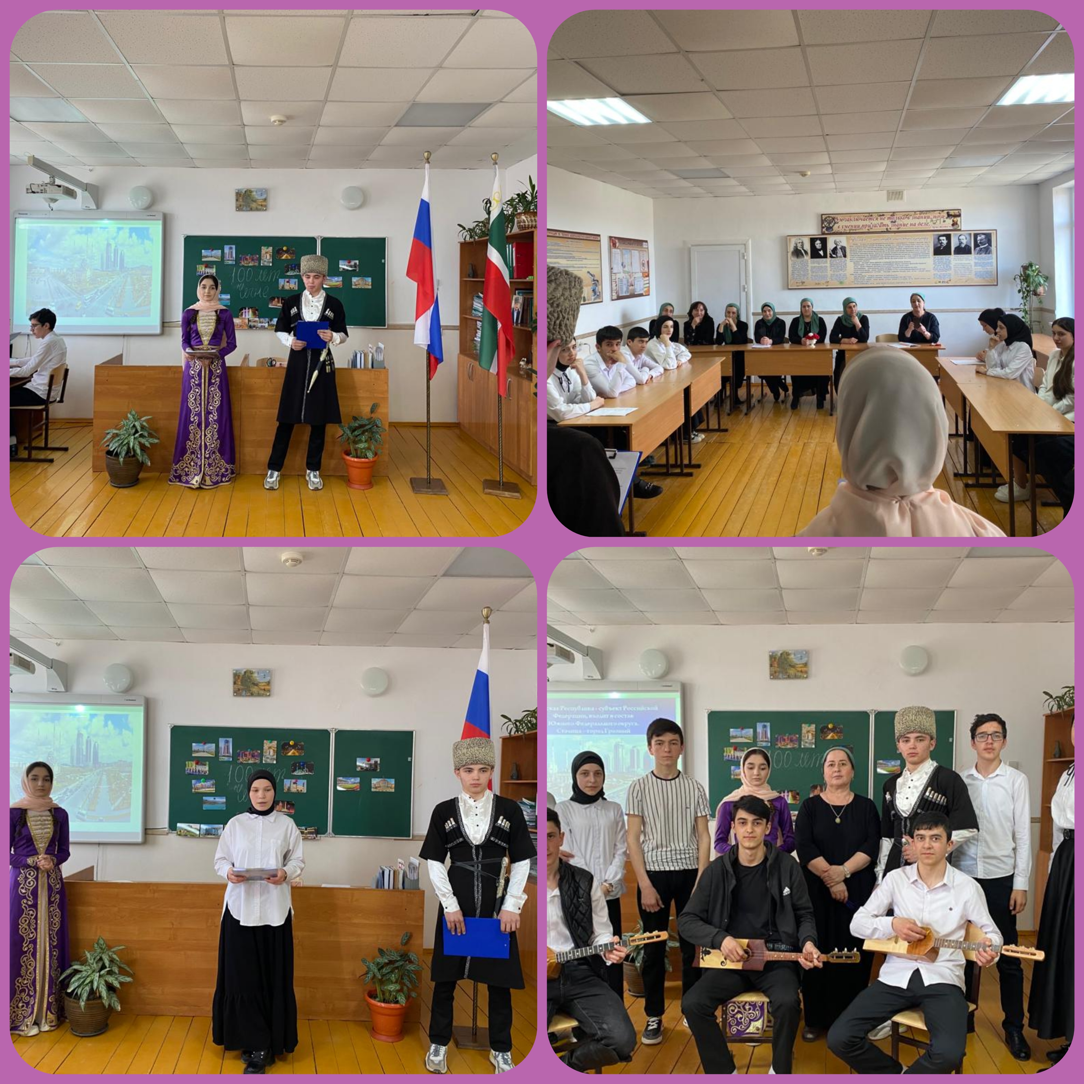 В 10 «Б» классе МБОУ «Дышне-Веденская СОШ им.Загаева А.А» под руководством классного руководителя Пашаевой Х.С.был проведён открытый классный час посвящённый празднованию 100 -летия Чеченской республики .
