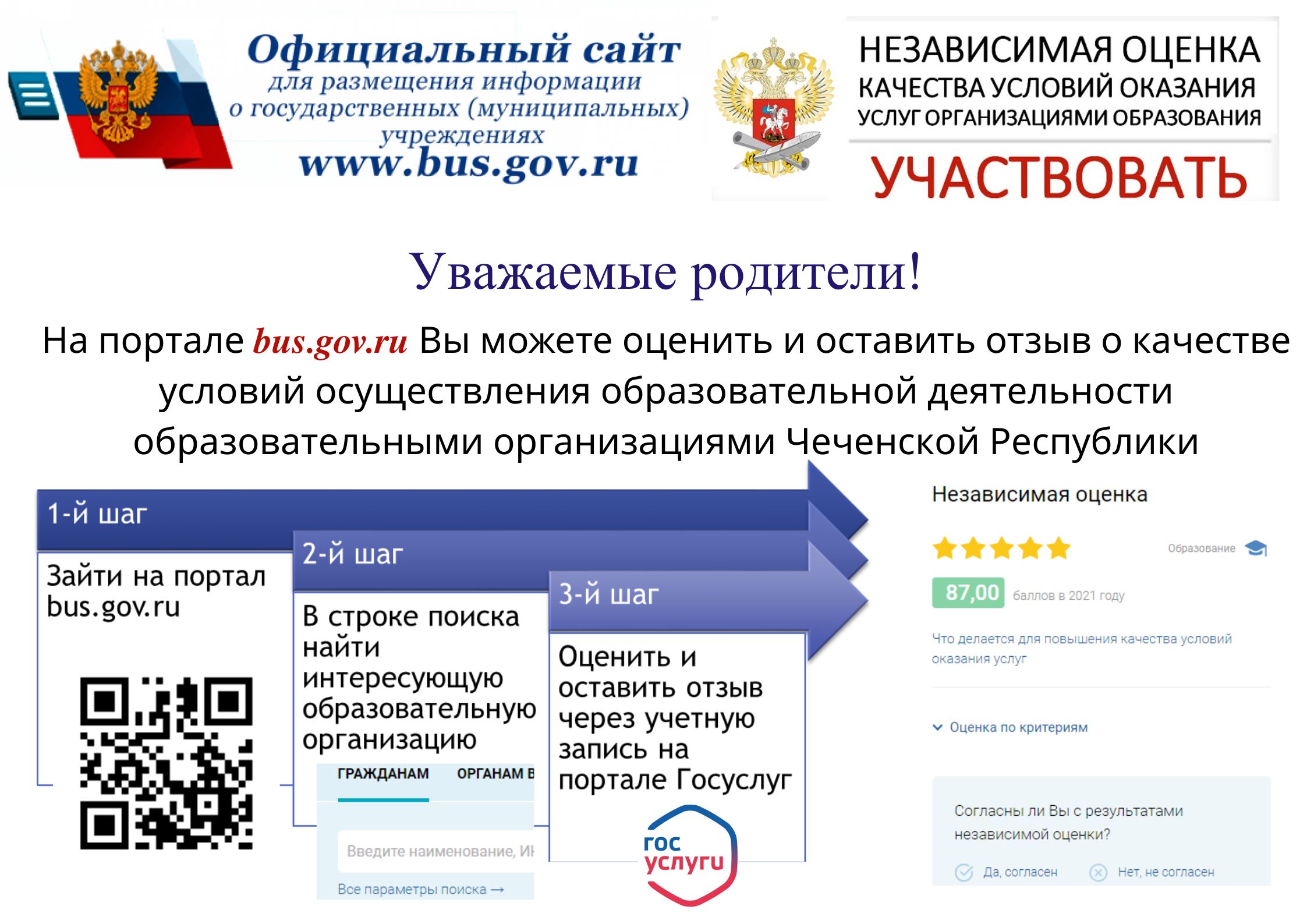 Уважаемые родители! На портале bas.gov.ru Вы можете оценить и оставить отзыв о качестве условияй осуществляющих образовательной деятельности образовательными организациями Чеченской Республики