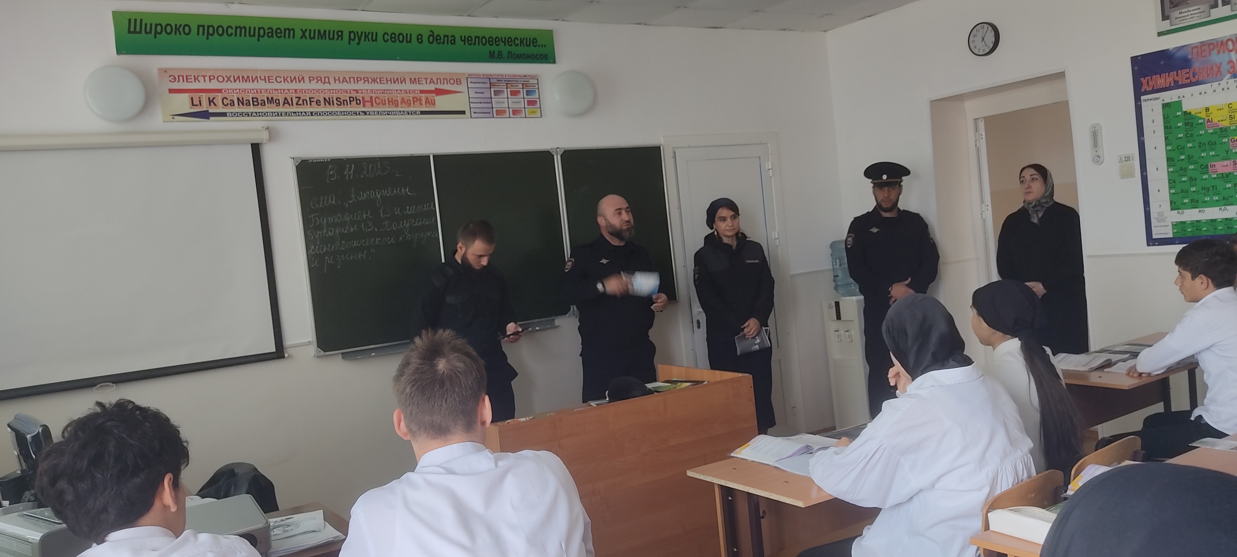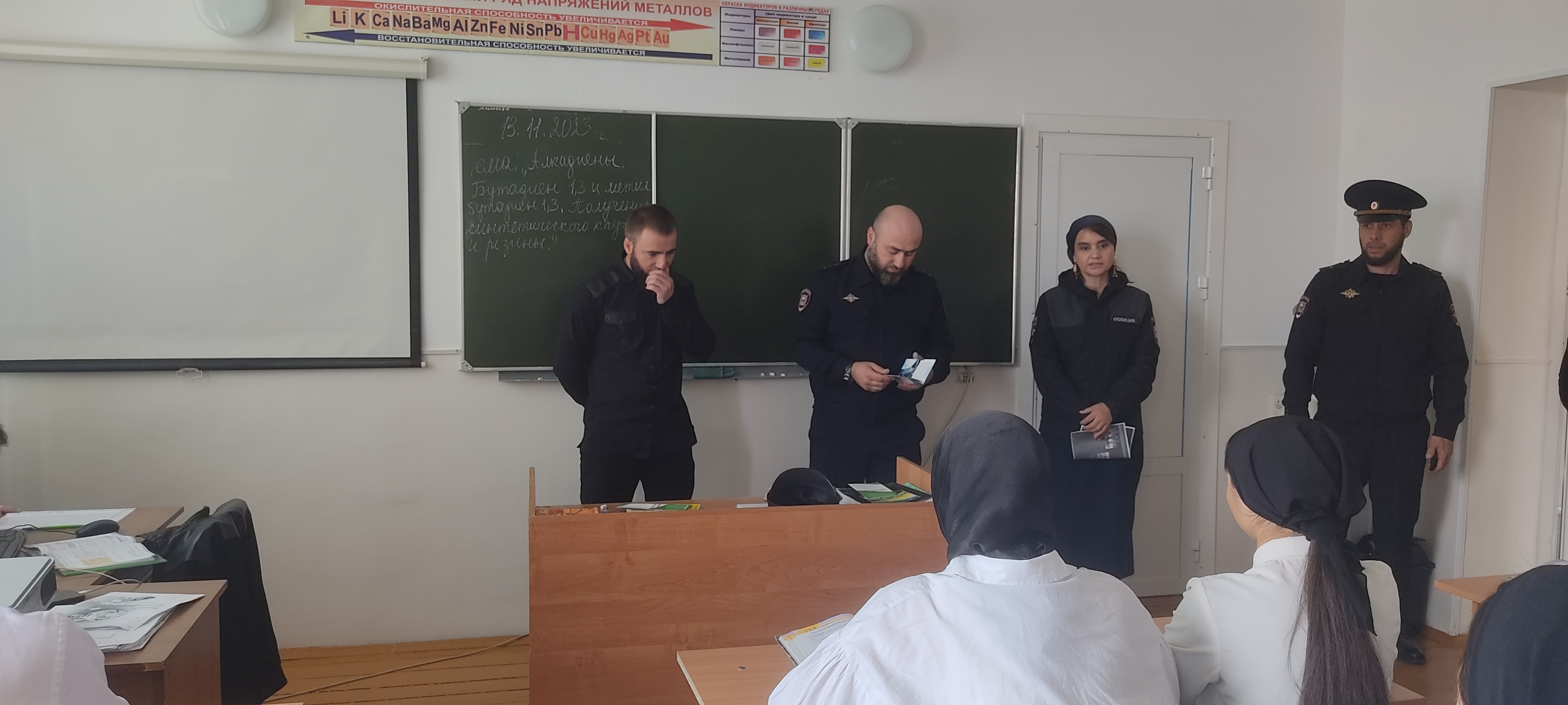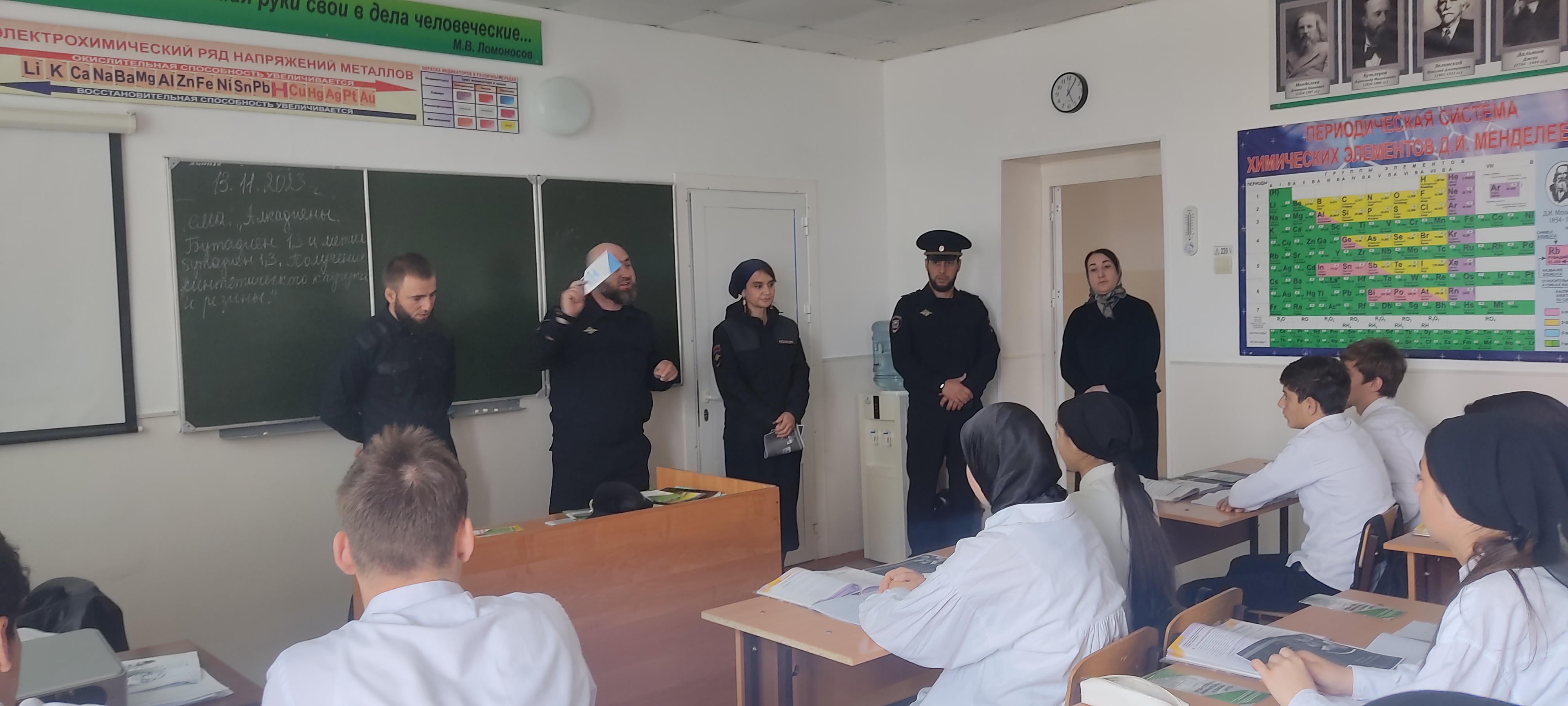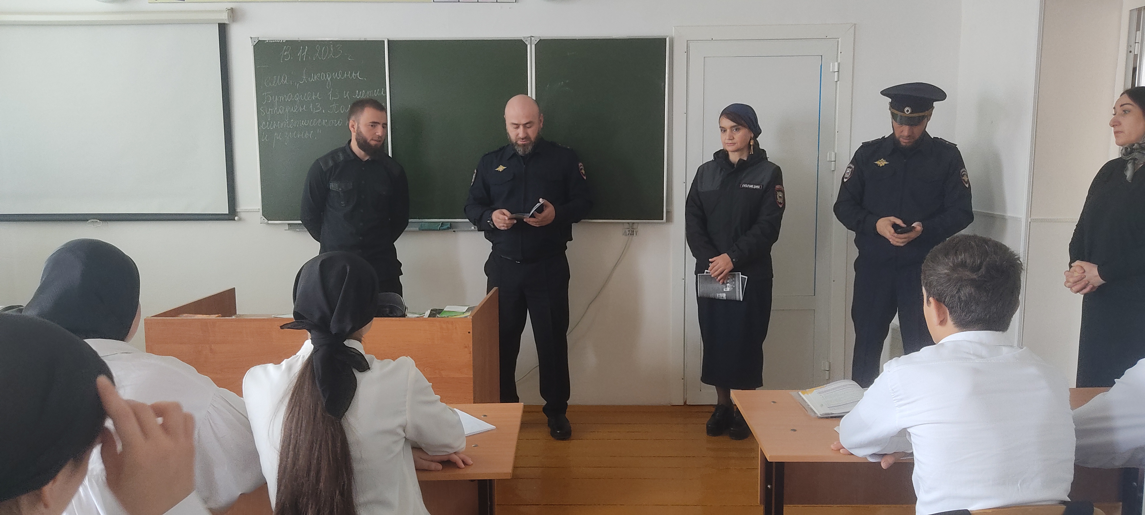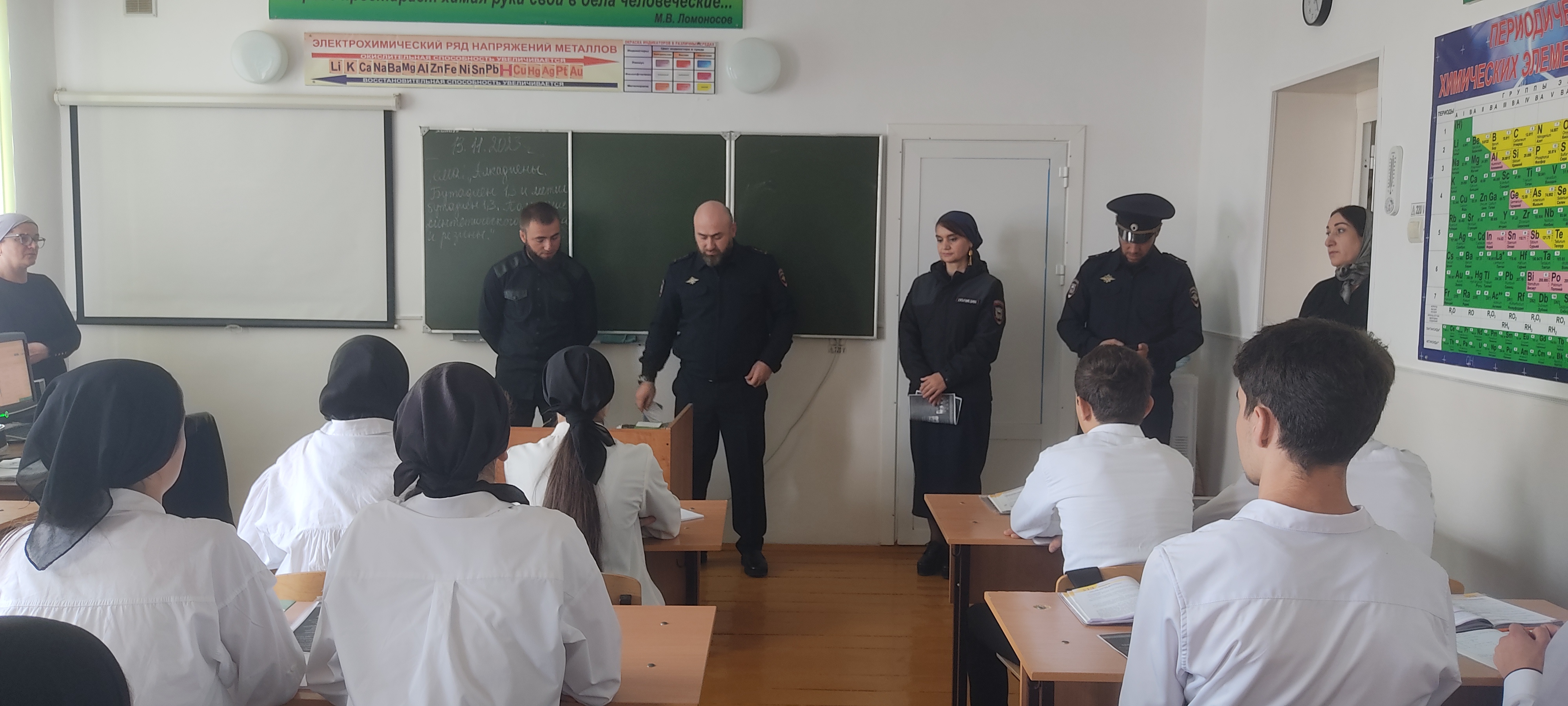 14.11.2023С целью профилактики преступности в молодежной среде, а также других праванарушений и преступлений, совершаемых несовершеннолетними, 13 ноября в нашей школе была организована встреча обучающихся с инспектором ОПДН ОМВД России по Веденскому району Д.М. Дугушевым и ВРИО начальником отдела гражданской и социально-правовой политики администрации района Сидиев А.С. лейтенантом полиции Ришнит Андреевной и участковым уполномоченным Ришнит Семенов Игоревичем.