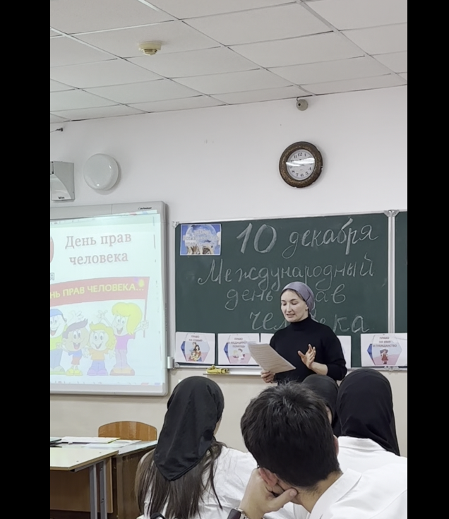 14.12.2023В 11 классе МБОУ "Дышне-Веденской СОШ им.Загаева А.А." прошло внеурочное мероприятие в честь Международного дня прав человека. Международный день прав человека отмечается ежегодно 10 декабря и призывает к сознательному осознанию и защите прав каждого человека независимо от его положения, вероисповедания, расы или пола.Целью этого дня является привлечение внимания общественности к нарушениям прав человека и поощрение диалога о важности соблюдения их.Мы осознаем, что образование является одним из ключевых элементов в повышении осведомленности о правах человека и поэтому нашим ученикам была предоставлена возможность углубить свои знания о Всеобщей декларации прав человека и рассмотреть важность ее соблюдения в нашей современной и сложной вселенной.