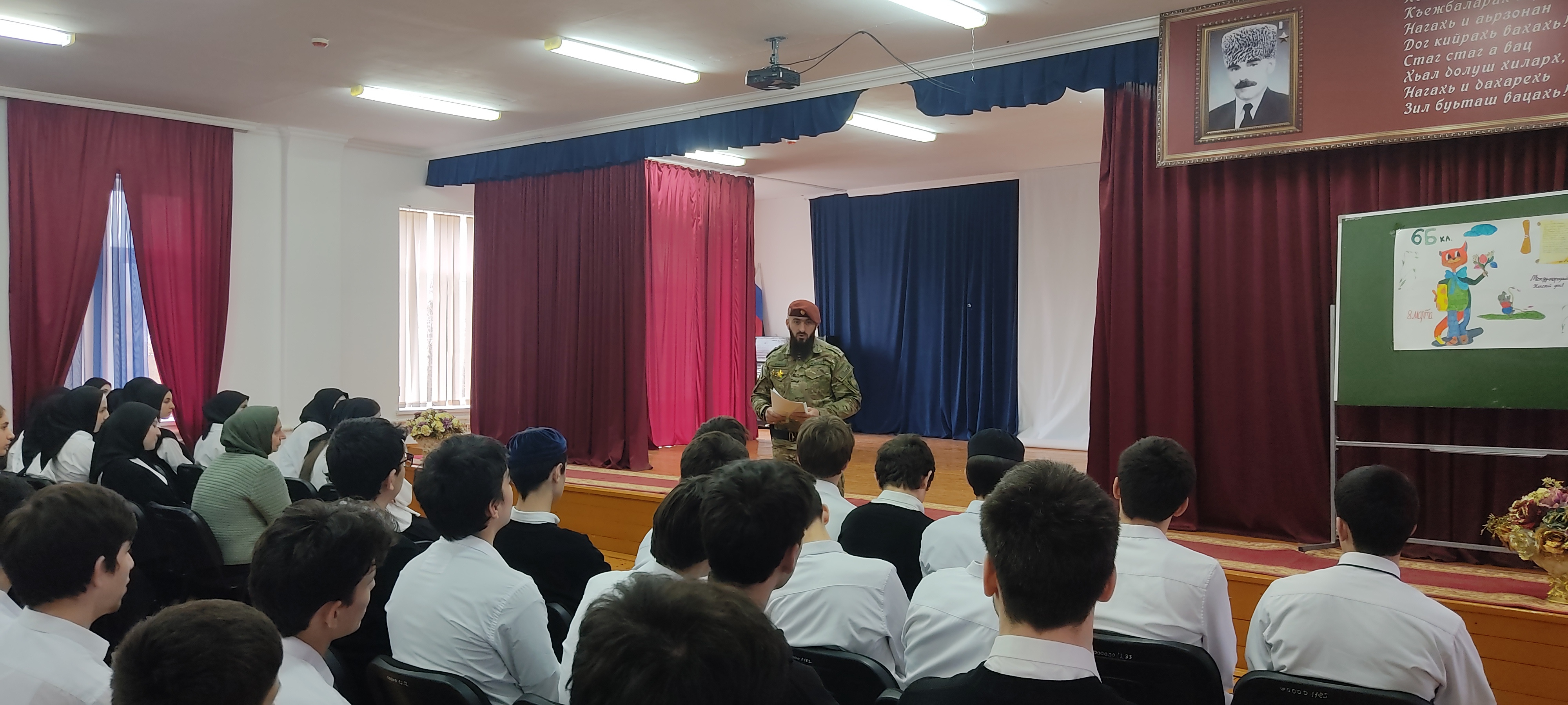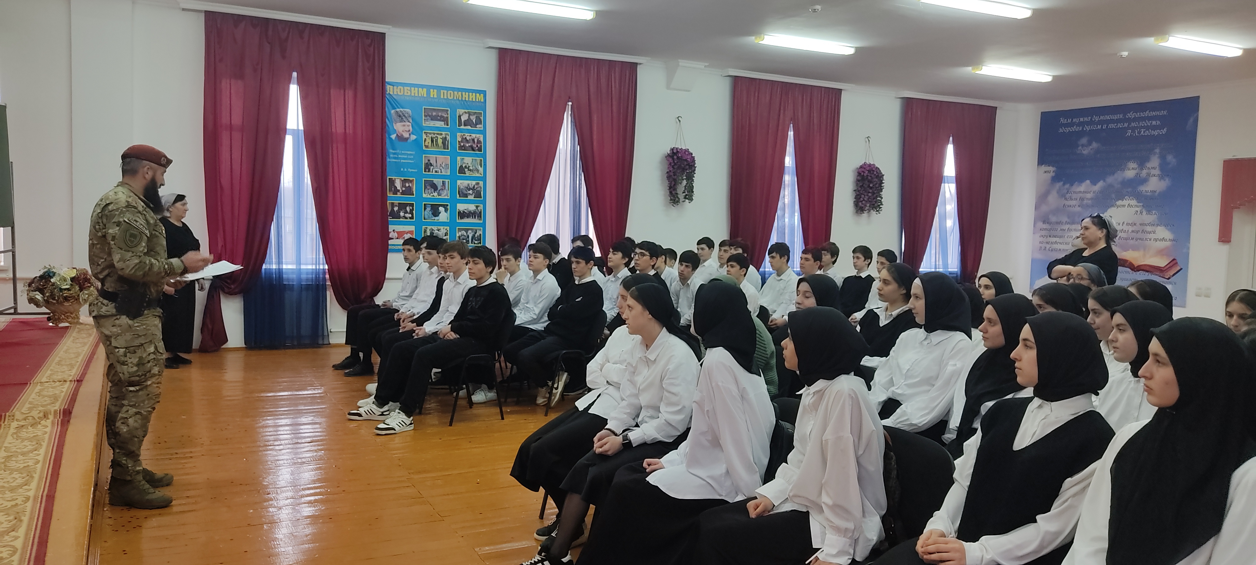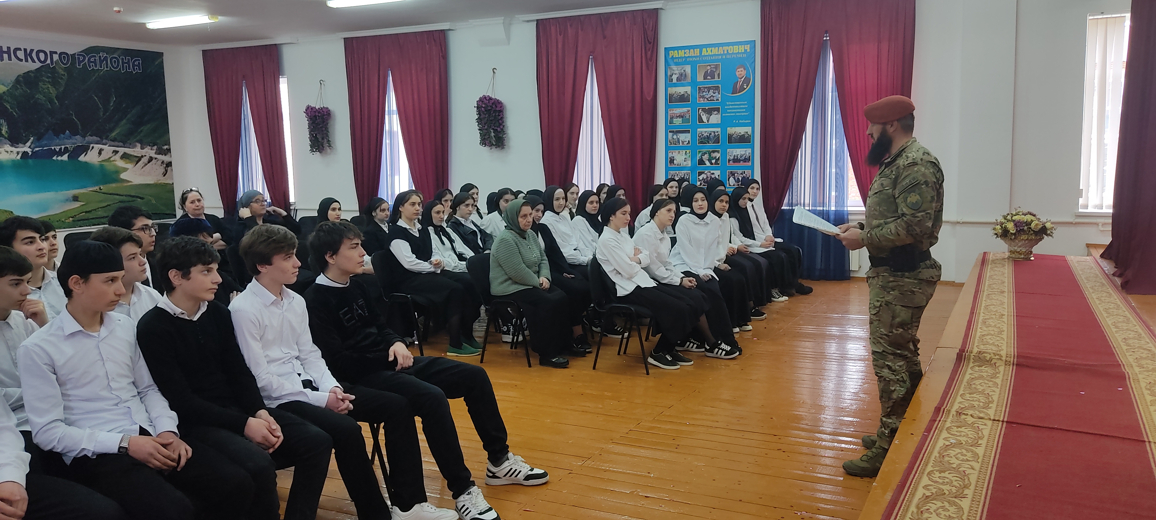 11.03.2024В рамках федерального проекта «Патриотическое воспитание», входящего в нацпроект Президента «Образование» 11 марта 2024 года в МБОУ «Дышне-Веденская СОШ им. Загаева А.А.» состоялось встреча с участником СВО командиром взвода ОР ОМОН «Ахмат-Грозный» лейтенантом полиции Макаровым Магомедом Сурхоевичом.
