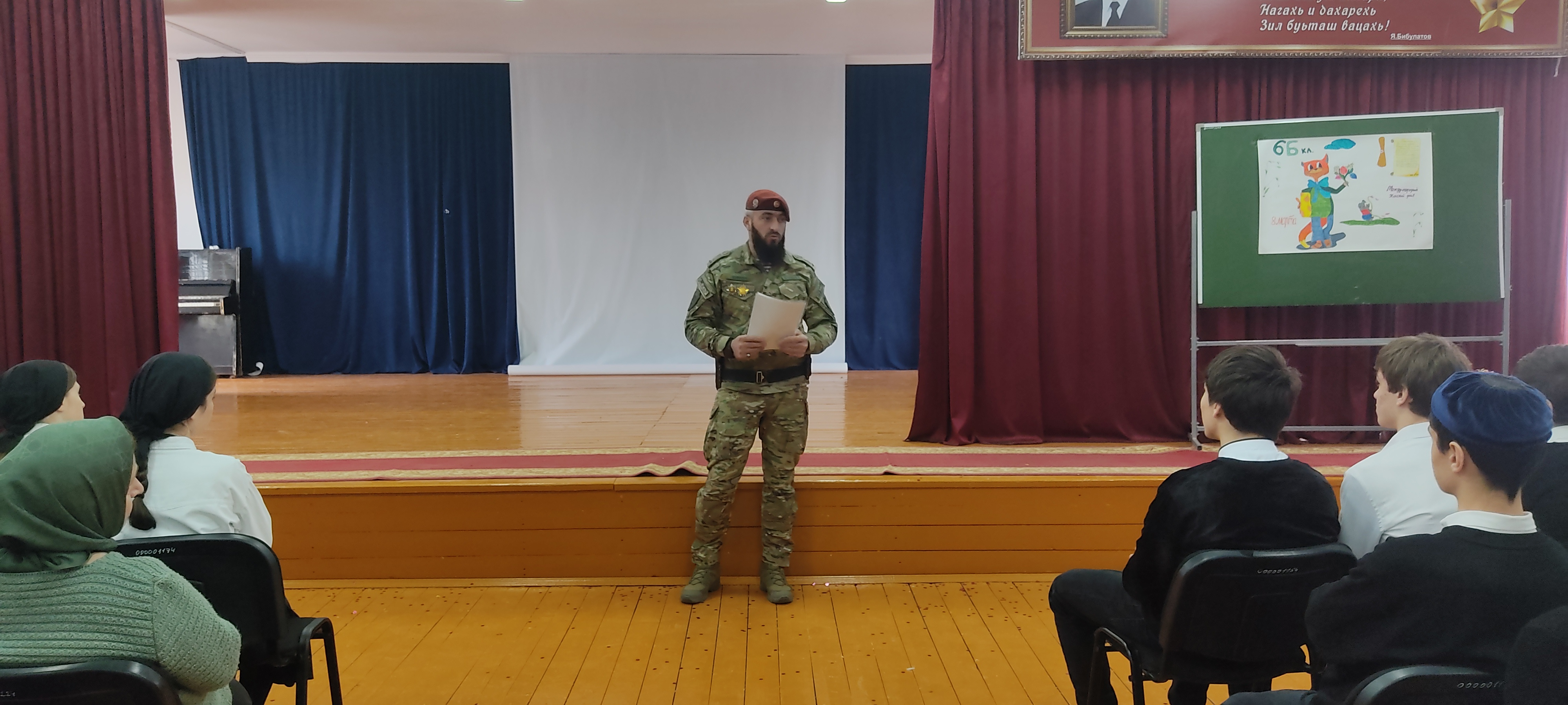 В нашей школе, произошло событие, которое оставило неизгладимый след в сердцах учащихся. Обучающиеся нашей школы стали свидетелями встречи с участником специальной военной операции на Украине. Участником этой операции оказался командир взвода ОР ОМОН «Ахмат-Грозный» лейтенант полиции Макаров Могомед Сурхоевич, ставший героем защиты своей родины. Он так же является обладателем символа и чести спецназа войск правопорядка-Краповым беретом. Встреча проходила в формате живой беседы.