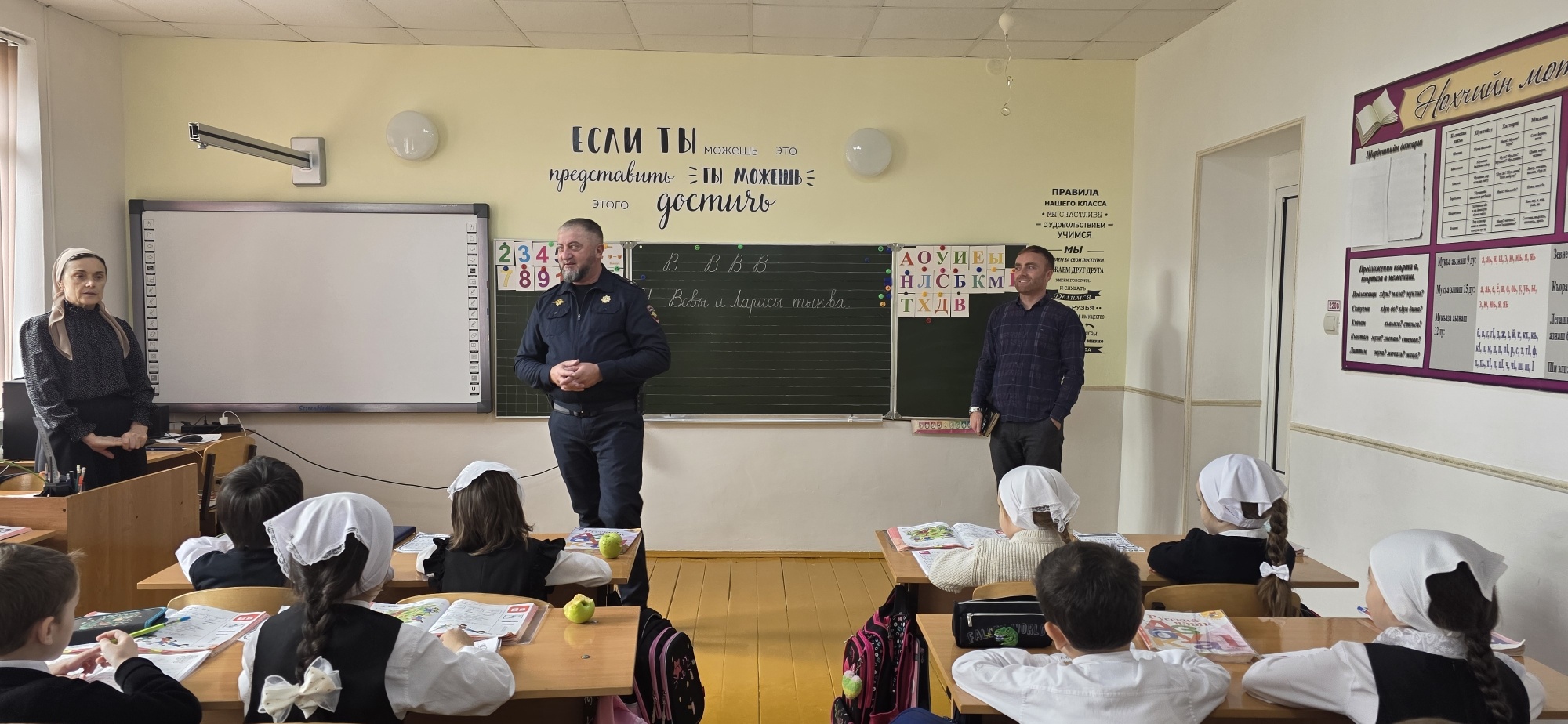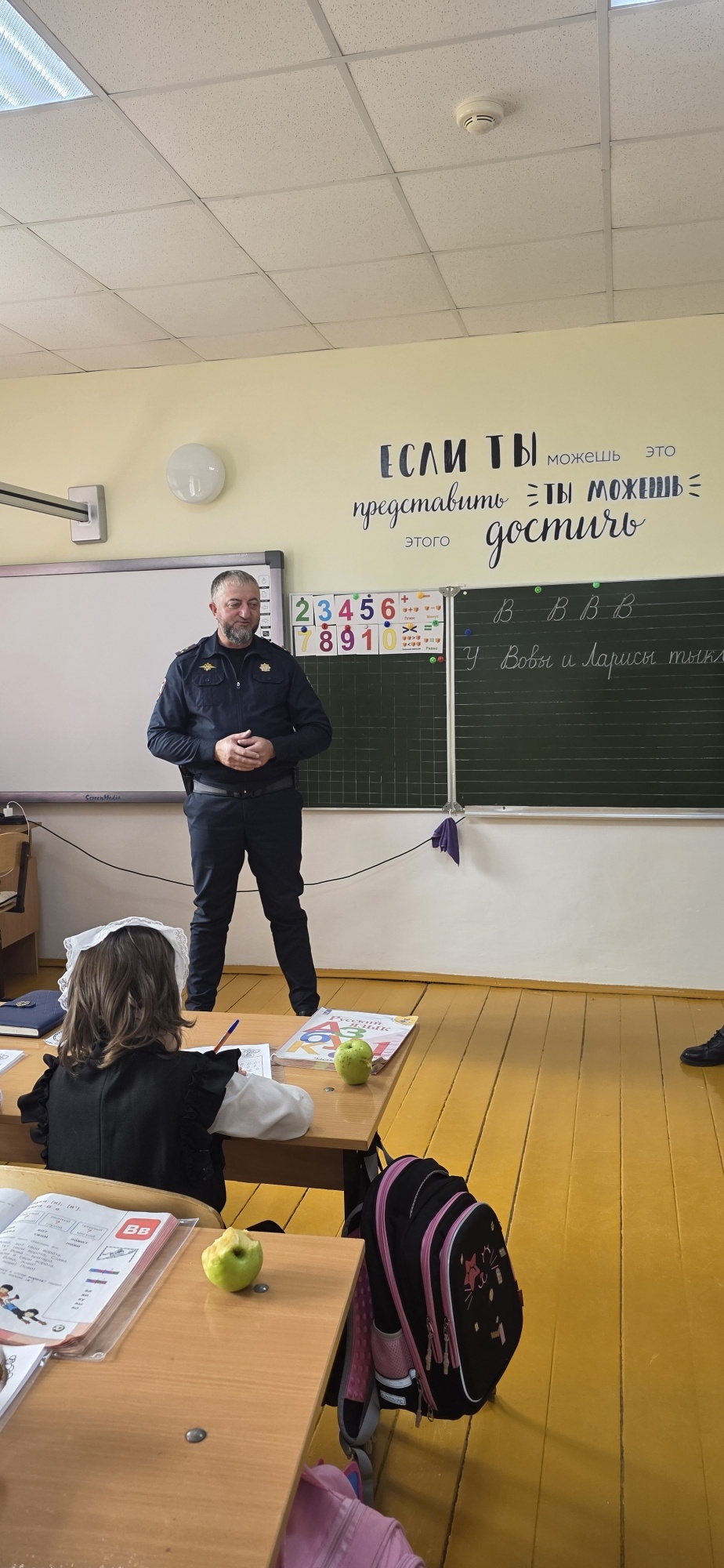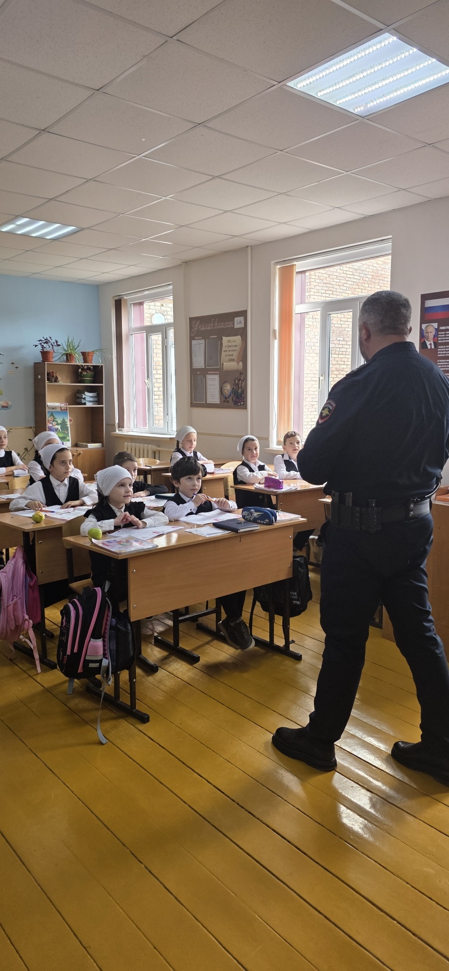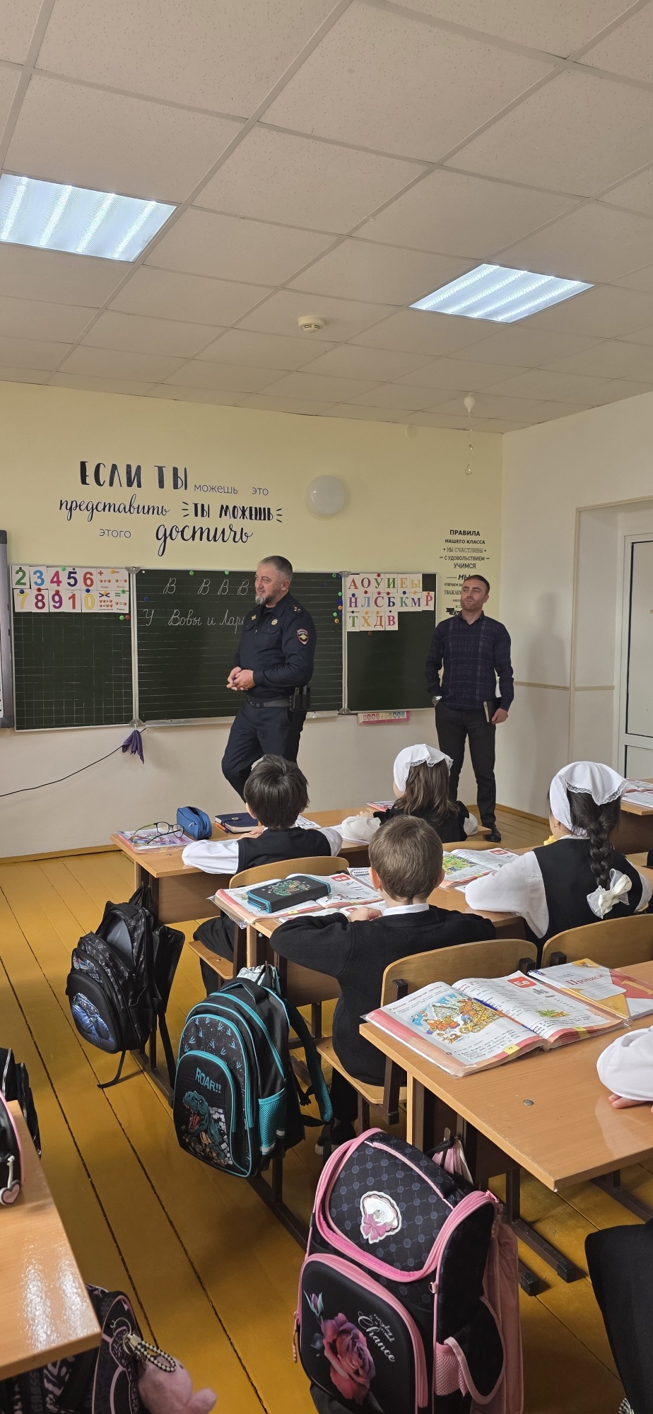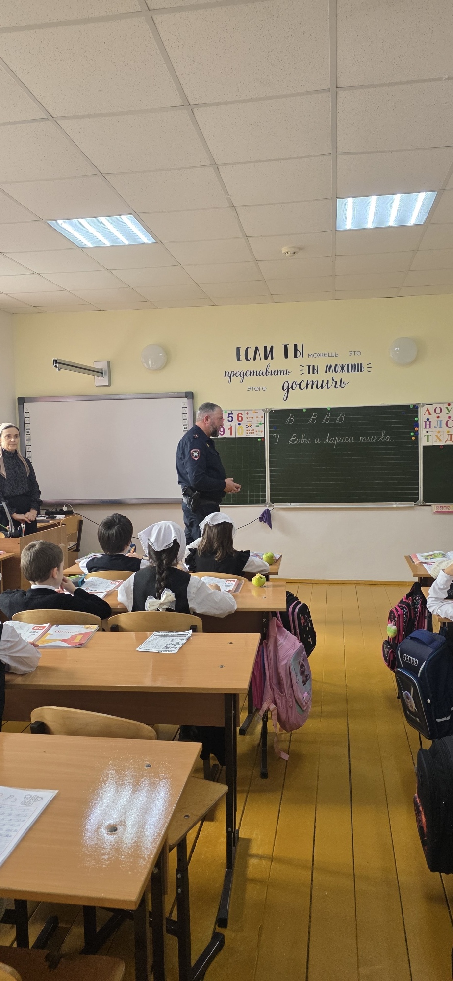 Сегодня в нашей начальной школе прошла профилактическая беседа по безопасности на дорогах. Встречу провёл старший лейтенант полиции ОГИБДД совместно с представителем районного отдела образования — методистом по физической культуре и ГОЧС.