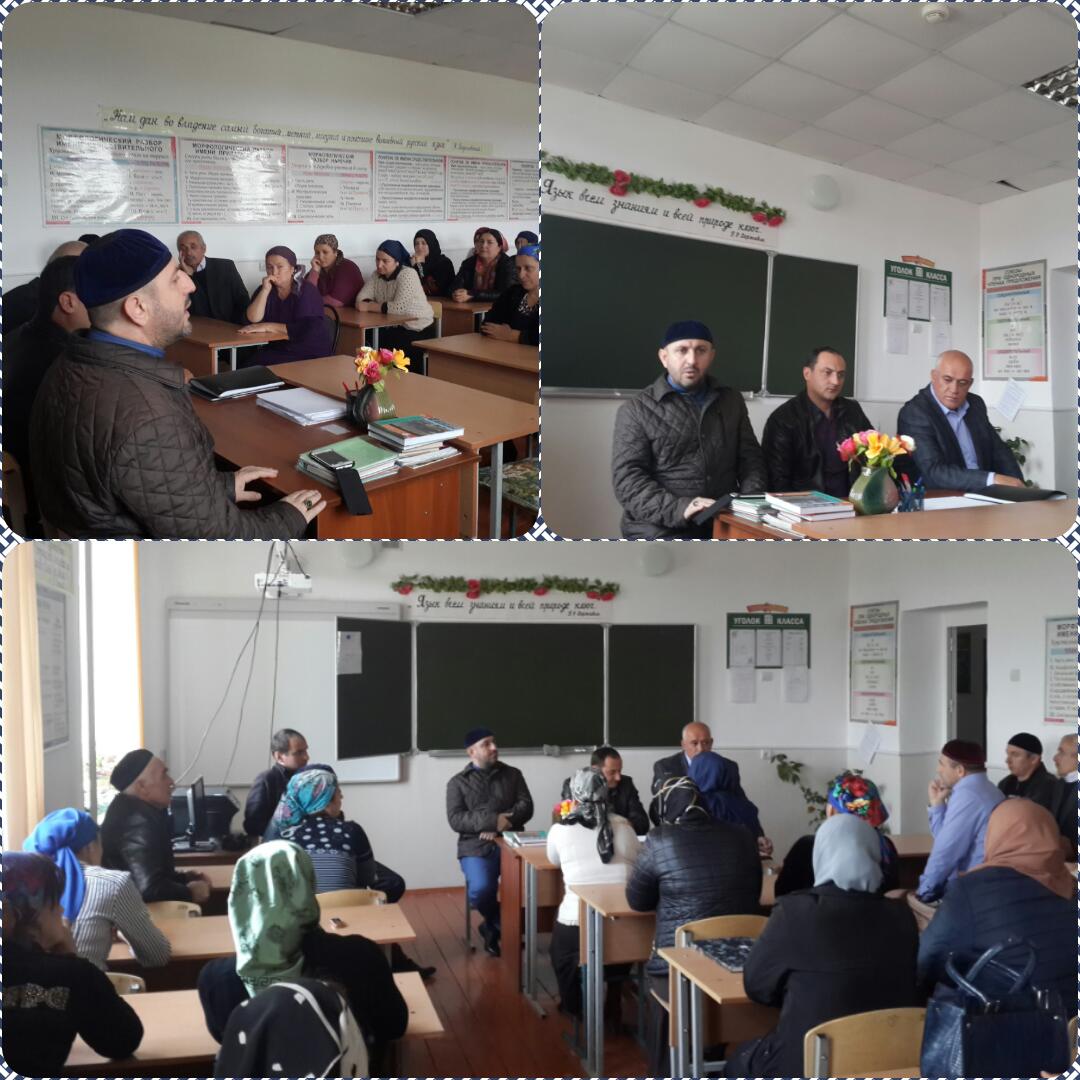 21.10.201521.10.2015г в МБОУ «Дышне-Веденская СОШ им. Загаева А.А» состоялась встреча родителей с представителем духовенства кадии района Джафаровым А.Х. и сотрудником отдела Веденского района УФСБ России по ЧР Блиновой А.В. Темой встречи были события происходящие в мире на сегодняшний день.