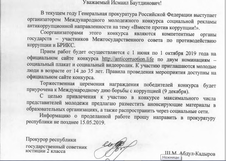 16.05.2019Администрация школы МБОУ"Дышне-Веденская СОШ им.Героя России Загаева А.А."доводит до сведения уч-ся, их родителей (законных представителей) и всех посетителей сайта,что в текущем году Генеральная прокуратура Российской Федерации выступает организатором Международного молодежного конкурса социальной рекламы антикоррупционной направленности на тему"Вместе против коррупции!".